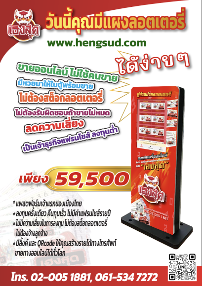 แผงลอตเตอรี่อัตโนมัติ 24 ชั่วโมง ทำงานด้วยตัวเครื่องเอง ติดตั้งได้ทุกที่ซื้อง่ายขายง่าย กำไรดีแบบไม่ต้องสต๊อกลอตเตอรี่ มีลอตเตอรี่พร้อมขาย