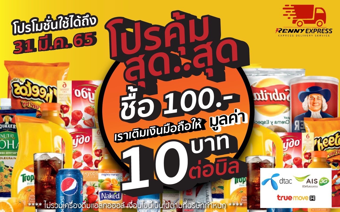 โปรโมชั่นดี้ดี ซื้อสินค้าครบ 100 บาทรับฟรี 10 บาทในการเติมเงินโทรศัพท์มือถือฟรีทุกเครือข่าย รีบหน่อยนะคะ โปรนี้เขามีถึงสิ้นเดือน มีนาคม2565 นี้เท่านั้น